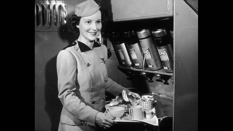 Nash remembers the days when they had to work harder physically. They used to serve a large meal tray. In the 1940s, a Canadian Colonial Airways flight attendant is shown serving food and refreshments.