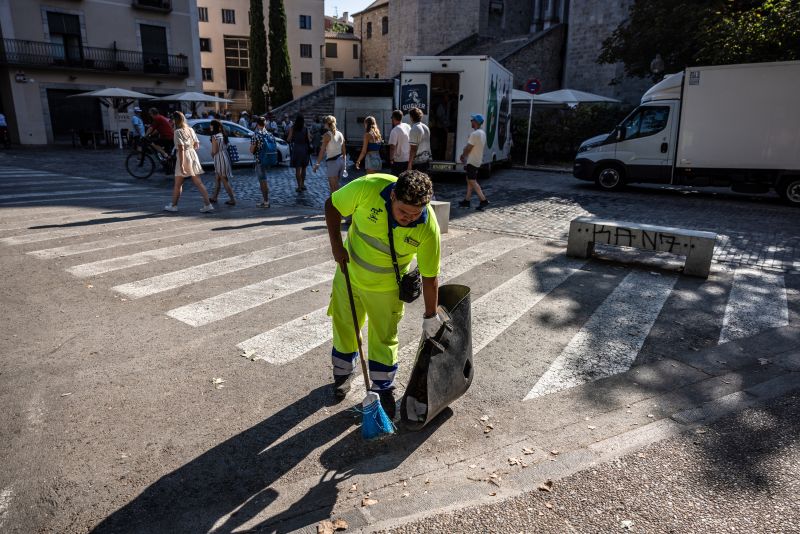 A municipal worker is seen cleaning the streets in front of the Cathedral of Santa Maria in Girona, Spain. The work is being done during a period of high temperatures in the old town area on Wednesday, Aug. 23, 2023.