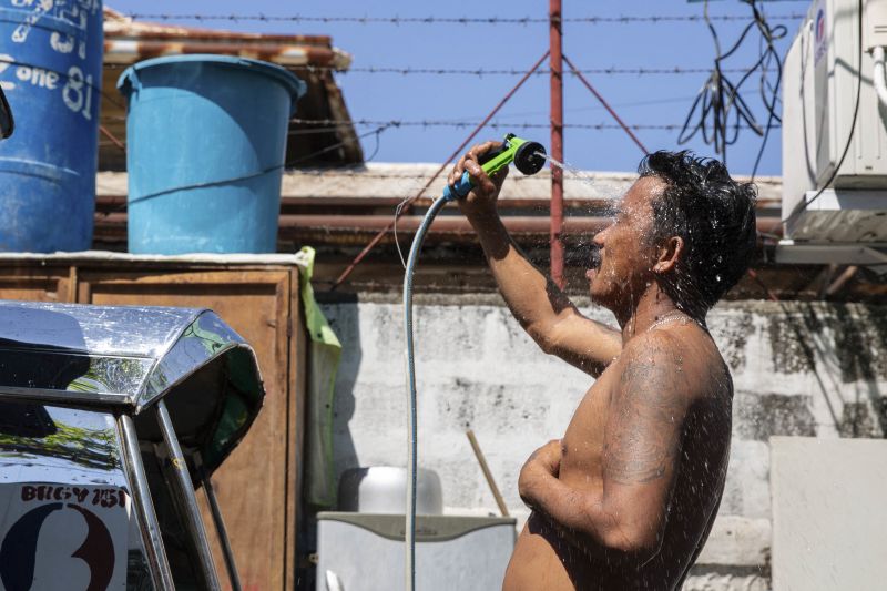 A man in Manila is shown taking a shower with a hose to cool off during hot weather on April 28, 2024. The Philippines has decided to cancel in-person classes in all public schools for two days because of the extreme heat and a nationwide strike by jeepney drivers, as announced by the education department on the same day.