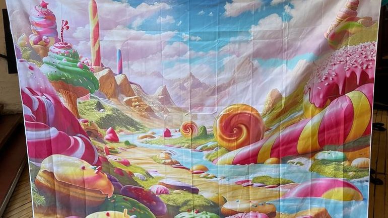 Two backdrops sold by the record store show a vibrant candyland scene, while another one in black and white was used for a "Time Tunnel." However, they did not match the fantastical images used in the event advertisements.