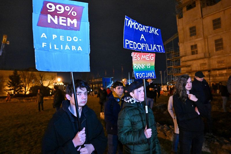 "99% say no to pedophilia," reads one placard. "They [the government] support pedophilia (and they blame it on us)," reads another, during a protest in Budapest, February 14, 2024.