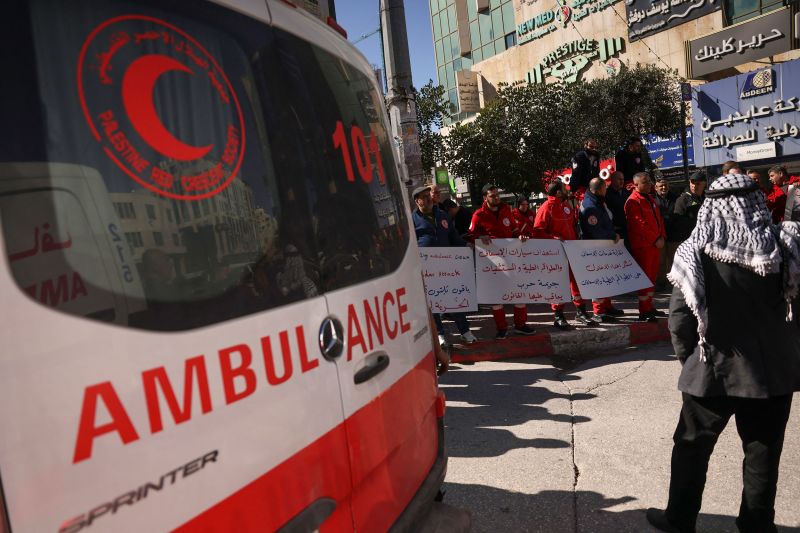 Paramedics from the Palestinian Red Crescent Society (PRCS) gather in Hebron, West Bank to protest the loss of their colleagues in the conflict between Israel and Hamas.