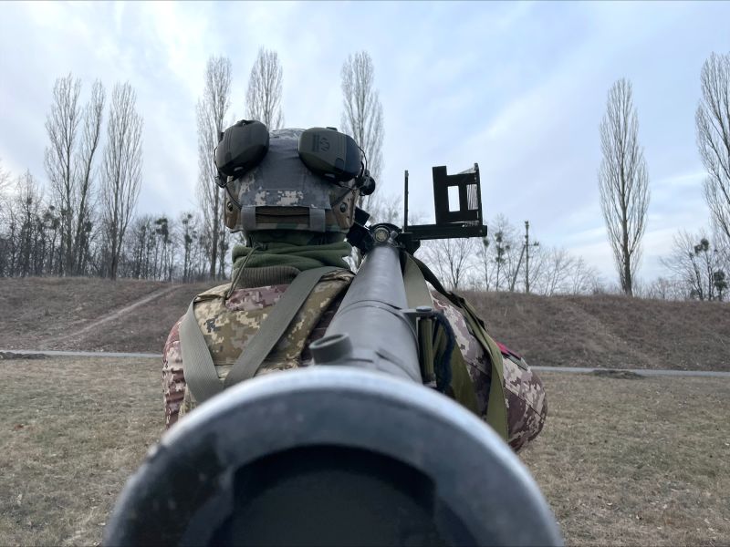 "Smeta" a soldier from a mobile air defense unit guarding the approaches to Kyiv, practices with a training unit for the US-made stinger missile system. (NB please stick close to this language as it's not a real missile in his hands). Some of the hand-held US missiles used by the mobile air defense units were manufactured in the 1980s, the unit said, years before some of the soldiers were born. Ukrainian air defense troops practice drills with a Soviet-made anti-aircraft cannon outside Kyiv.