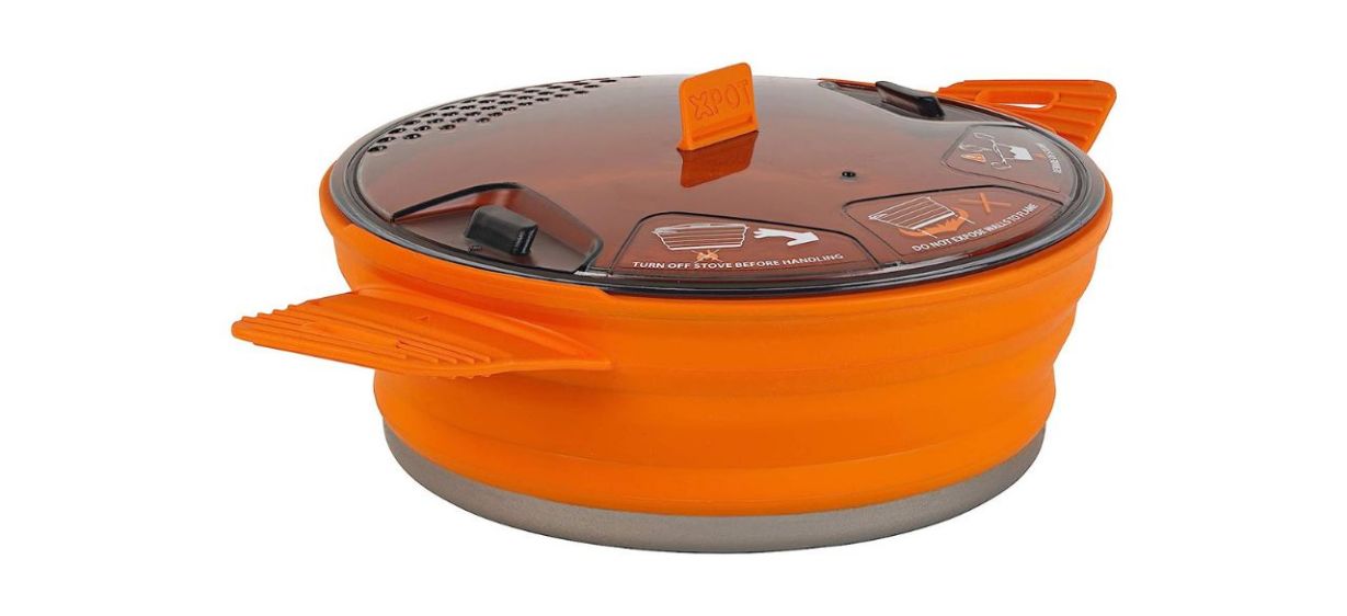 Sea to Summit X-Pot Collapsible Camping CookpotThis camping cook pot ensures food safety as it is heat-resistant and BPA-free. It is designed to be collapsible, making it convenient for storage in small spaces. The aluminum base of this pot conducts heat evenly, providing the best cooking experience. Additionally, it comes with a strainer lid.